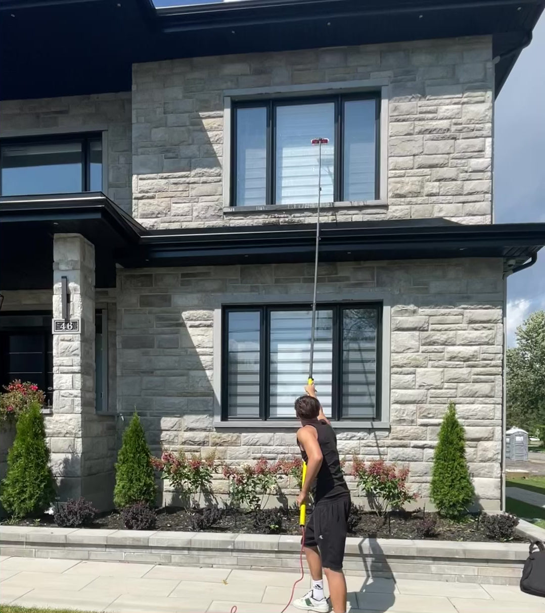 Jetez un coup d'œil à notre dernière étape de lavage de vitres extérieurs. Le rincage complet de la vitre avec l'eau pure et filtré pour laisser une finition parfaite durant toute la saison!